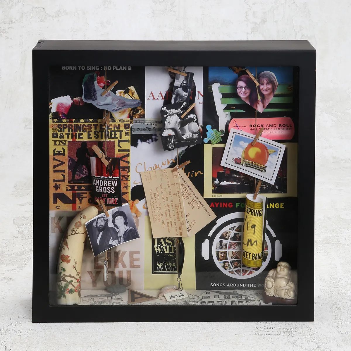Each box is reflective of the things we held dear: we backed one box with cd liners of some of our favorite bands, ticket stubs to outstanding musical performances, reminders of places that we had traveled to that held a special place in our hearts. A nod to the moped that came to be synonymous with Peter while living in Newport. Favorite photos and memorabilia all strung together with tiny clothespins which were kind of a signature item for us. (these re-appear down the road).