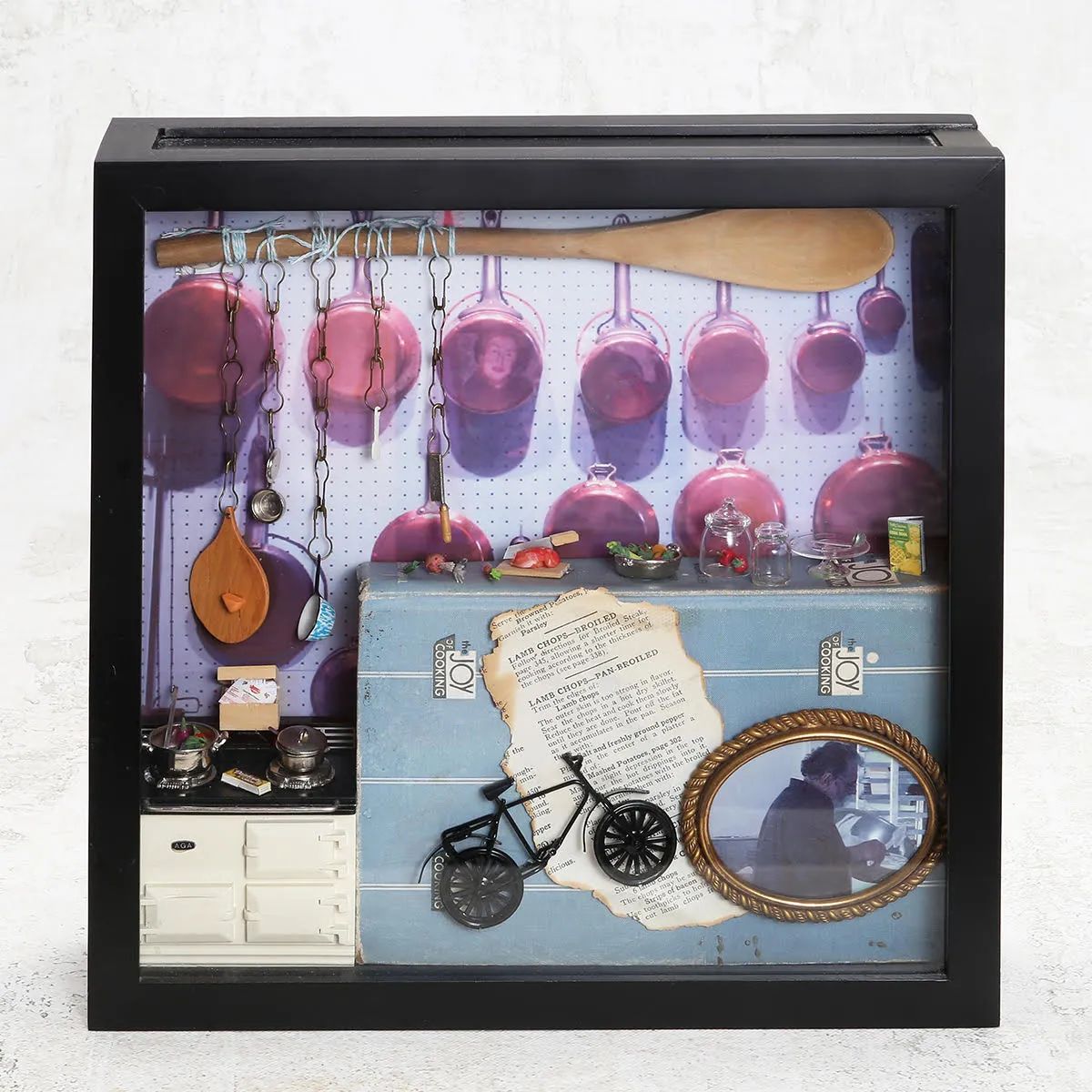 And of course a tribute to his love of all things food for his third box via another life-long chef friend: the wooden spoon he was never without, an authentic joy of cooking cookbook, a very cool backdrop with Julia Child peeking through, an old recipe with a nod to his love of lamb, tiny hanging cooking utensils and miniature stove with pots on top…..all so very personal but fun, whimsical, and full of the life we had all shared…….what could be better than that. Simply ingenious!